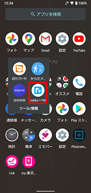 [ツール/情報]フォルダをタップし[radiko+FM]をタップする